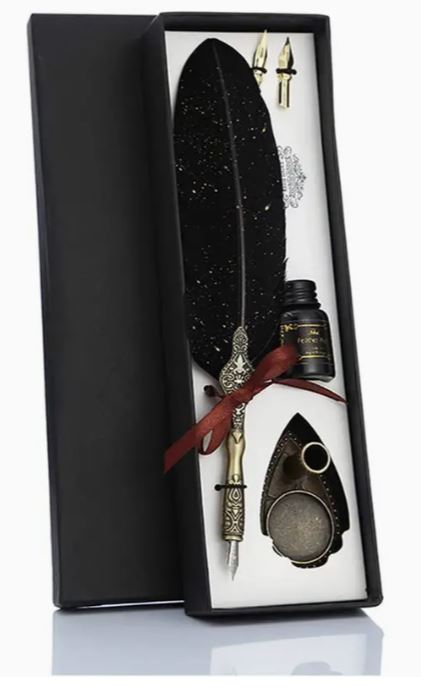 Lasi- & sulkakynäsetti, pidike ja 5 mustepulloa