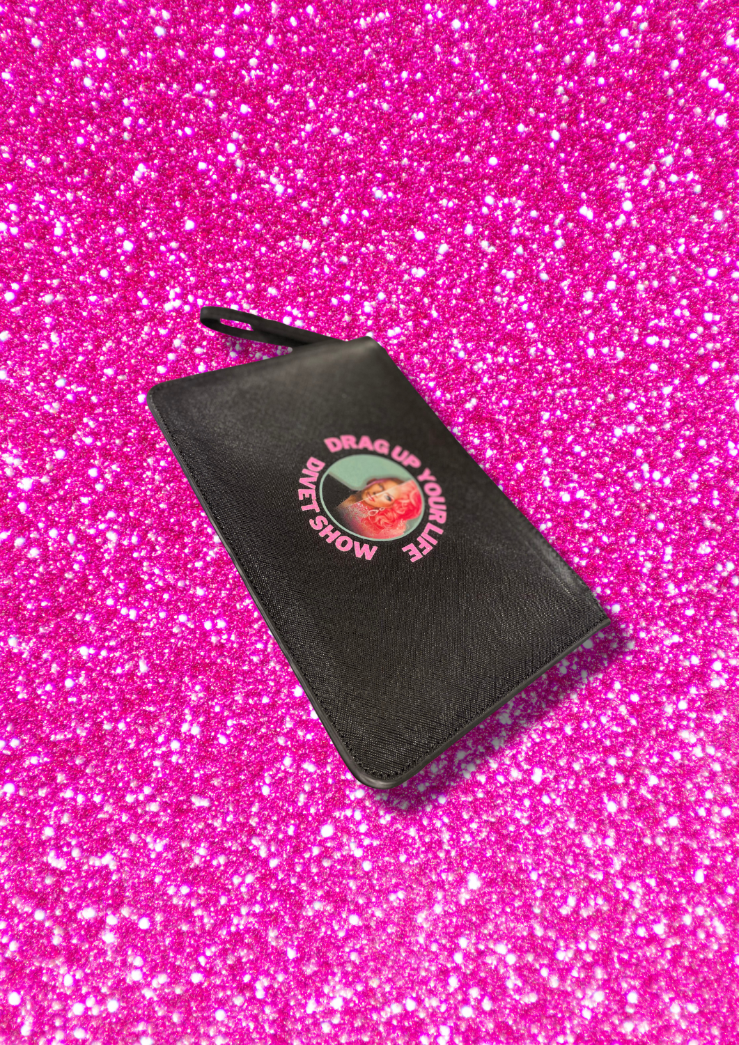 Pieni musta vetoketjullinen laukku Divet logolla.